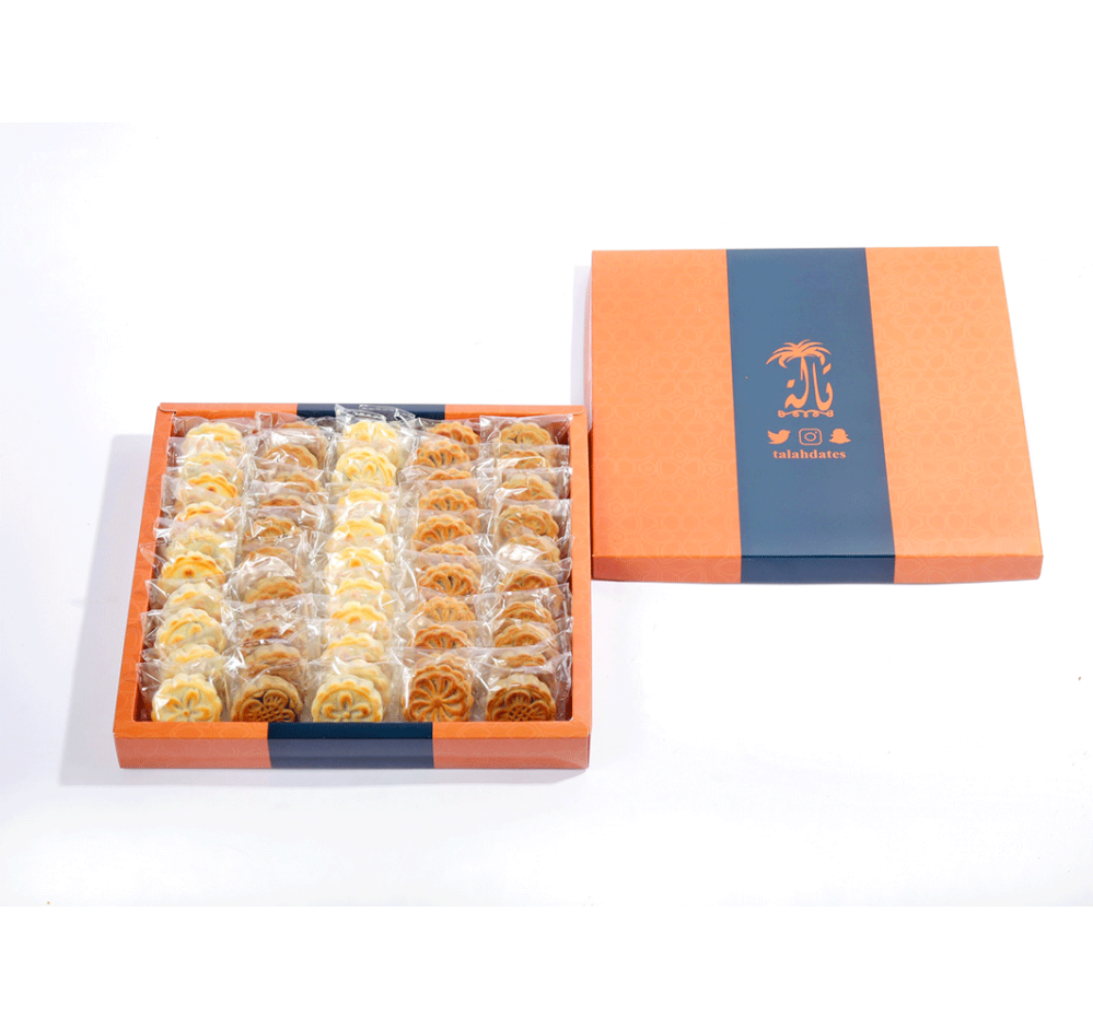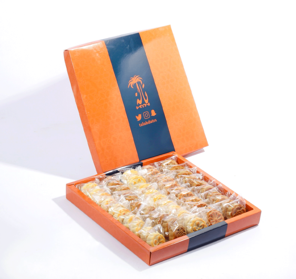 اكتشف التميز مع علبة المعمول المشكل الفاخر من تالة التمور، التي تحتوي على ثلاثة أنواع مميزة من المعمول: